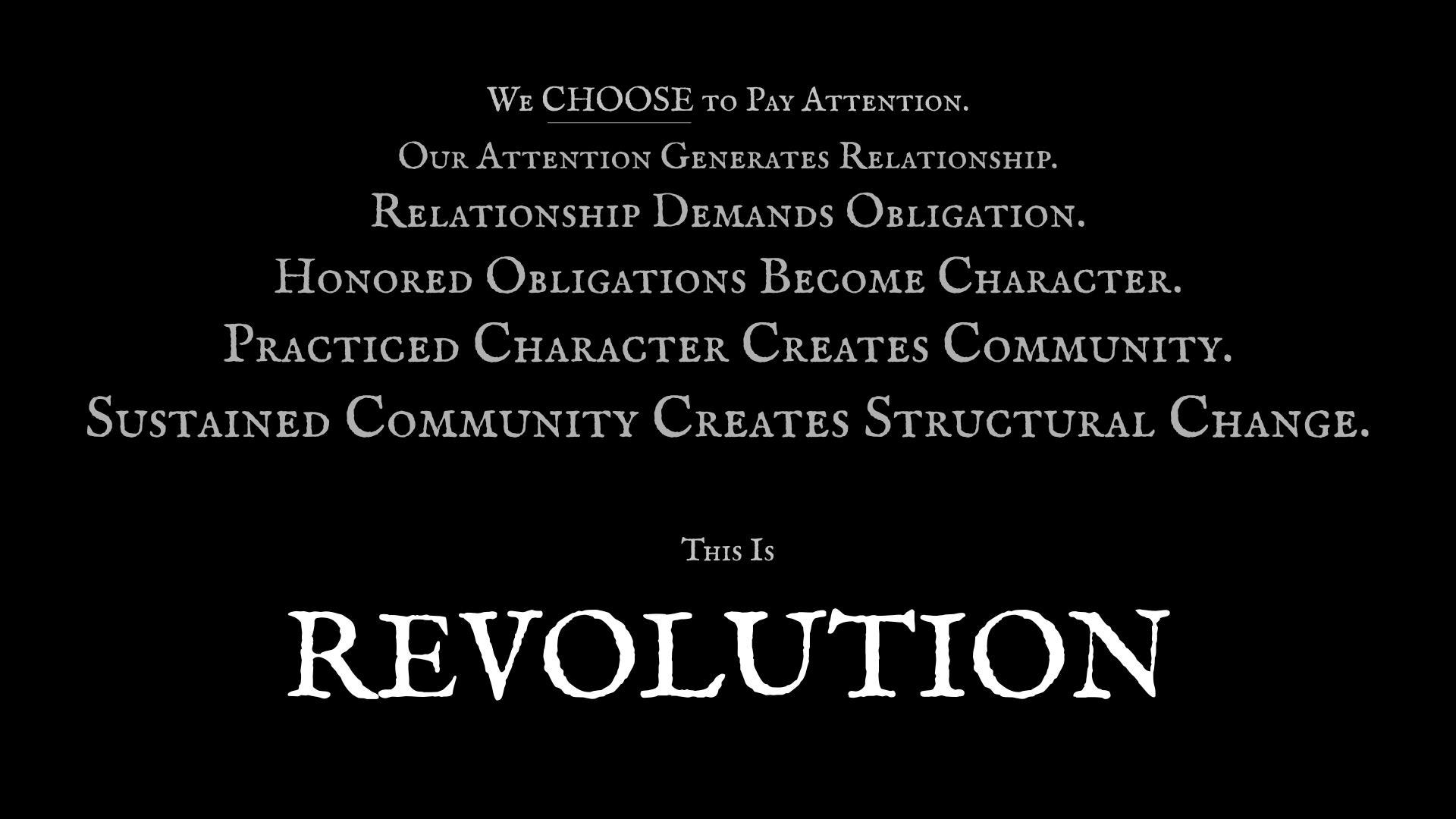 The formula at the center of this series, we choose to pay attention; our attention generates relationship, is not describing a feeling. It is describing a practice, and a demanding one.